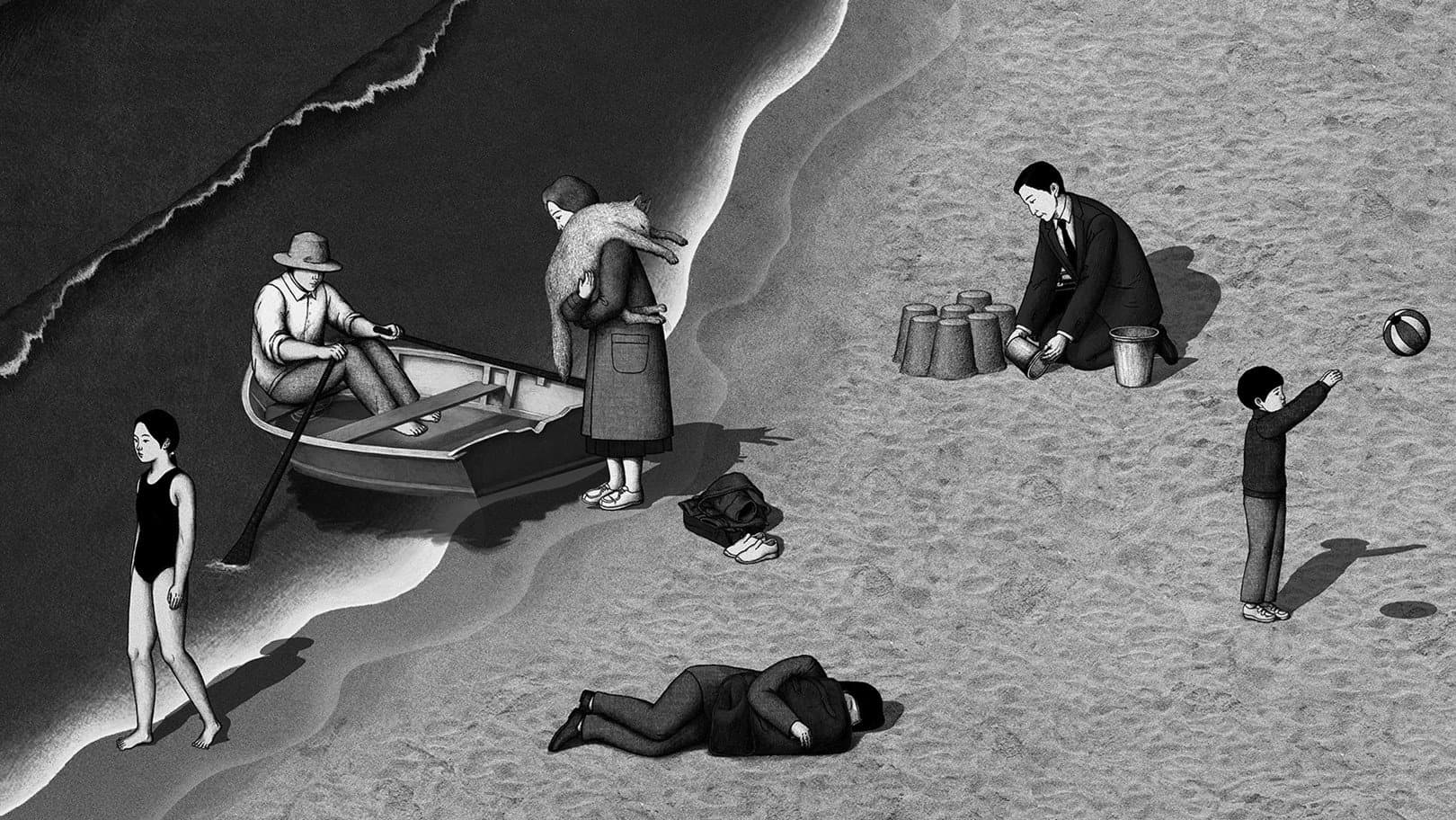 Waves coming and going on an empty beach. Various people, from children to the elderly, appear one by one on the beach. And, within the rhythm of the waves, each repeats their own actions.